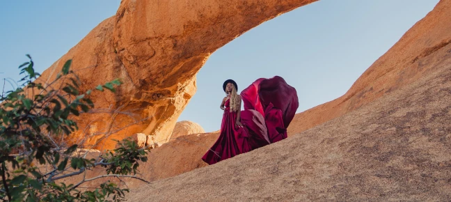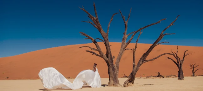 Strike a pose in the heart of Namibia’s most iconic desert! Join us for a once-in-a-lifetime flying dress photoshoot among the towering red dunes of Sossusvlei/Deadvlei. This full-day guided experience includes a professional photoshoot in a flowing gown of your choice, styled and assisted on-site, with the breathtaking dunes as your backdrop. You’ll enjoy golden sunrise moments, a light picnic in the desert, and visit famous sights like Sesriem Canyon – all while creating stunning images you’ll cherish forever.