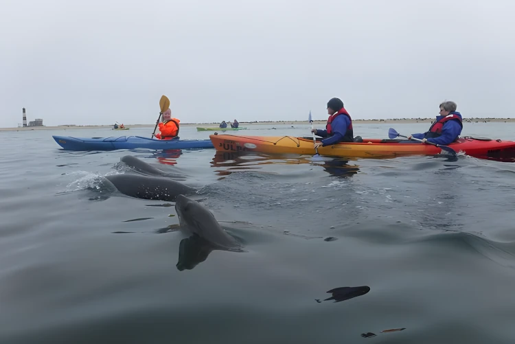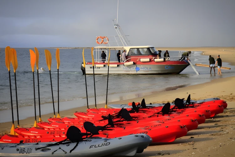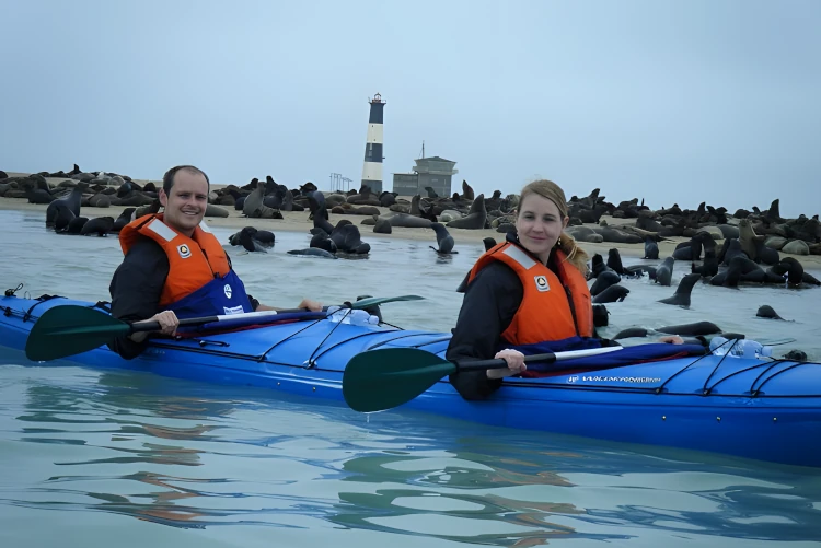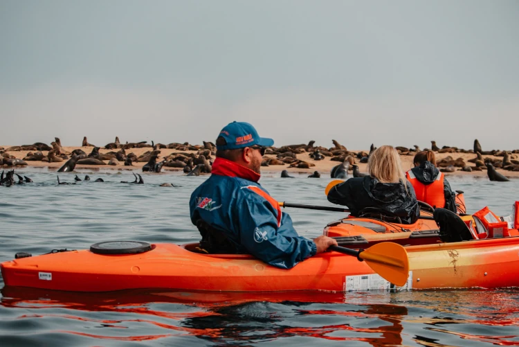 Check-in is at 08h00 at our offices at the Walvis Bay Waterfront for a 40-minute drive around the bay to Pelican Point. Along the way we pass lagunes with abundant bird life, as well as pink lakes that are part of the Walvis Bay Saltworks. Kayaking is done under the guidance of an experienced kayaking guide. We remain fairly close to the shore and explore seals playing around the kayaks. With a bit of luck we may be joined by bottlenose dolphins and may spot even a whale or two in season.