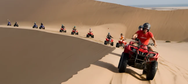 Kick off your desert adventure in Swakopmund with an exhilarating quad bike ride across the rolling dunes, feeling the thrill of speed while taking in the breathtaking beauty of the Namib Desert. Then, switch to a peaceful camel ride, offering a relaxing way to take in the stunning landscapes. A combination of excitement and relaxation. The tour includes bottled water and quad bike safety gear for a safe and comfortable experience.