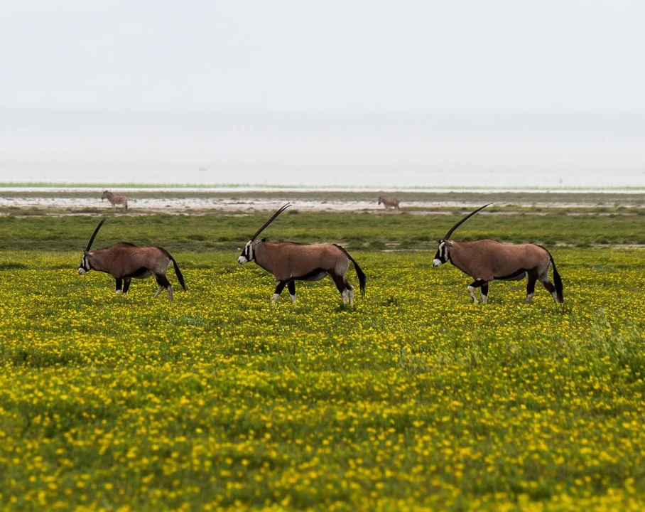 Stretching over 4,800 square kilometers, the Etosha Pan is a shimmering salt desert that seems to go on forever. This vast, otherworldly landscape is a remnant of an ancient inland lake and plays a vital role in the park's ecosystem. During the rainy season, it transforms into a shallow lake, attracting thousands of flamingos and pelicans, creating a rare and stunning spectacle. In the dry season, its cracked white surface reflects the sun like a mirror, offering one of the most surreal and photogenic settings in all of Africa. Standing at its edge is like looking into another world.