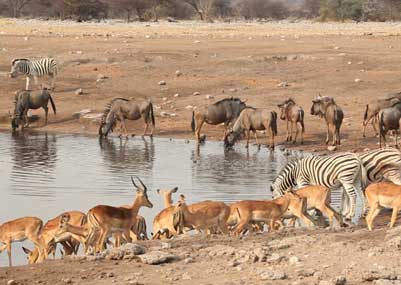 The route today takes you on a game drive to the various waterholes in the vicinity of Okaukuejo Restcamp. This evening you can relax by Okaukuejo’s excellent floodlit waterhole where game comes and goes throughout the night.