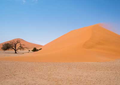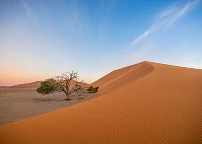 After an early breakfast we go on an excursion to Sossusvlei with sand dunes along both sides of the road. We will stop at the famous Dune 45. Those who feel fit may climb the dune and get a breathtaking view of the surrounding Namibian desert. We travel into the heart of the Namib Desert with the highest sand dunes on Earth at Sossusvlei. Experience the majestic yet tranquil Sossusvlei or the surreal Dead Vlei on foot. We enjoy a picnic lunch under the camel-thorn trees, before traveling back to our lodge via the gaping Sesriem Canyon.