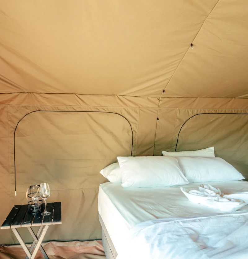 Choose from our comfortable luxury tents or opt for a more immersive experience in our self-camping tents. With 11 campsites available, we can host up to 30 guests per day. Whether you're camping under the stars or enjoying the cosy interiors of our luxury tents, we ensure your stay is relaxing and memorable.