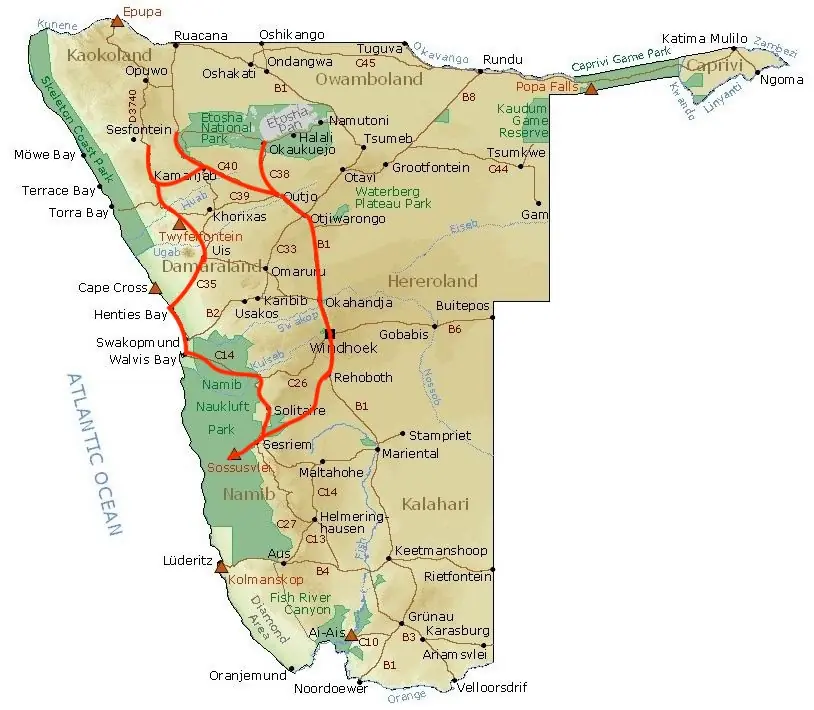 | 6 | Region d'Erongo | Erongo Wilderness Lodge | 220km - 2h30 | Visite de l'arche et du Bushman Paradise |